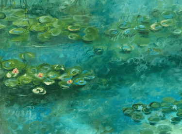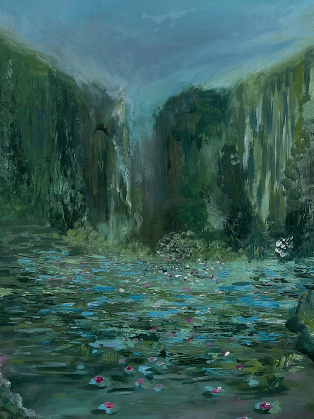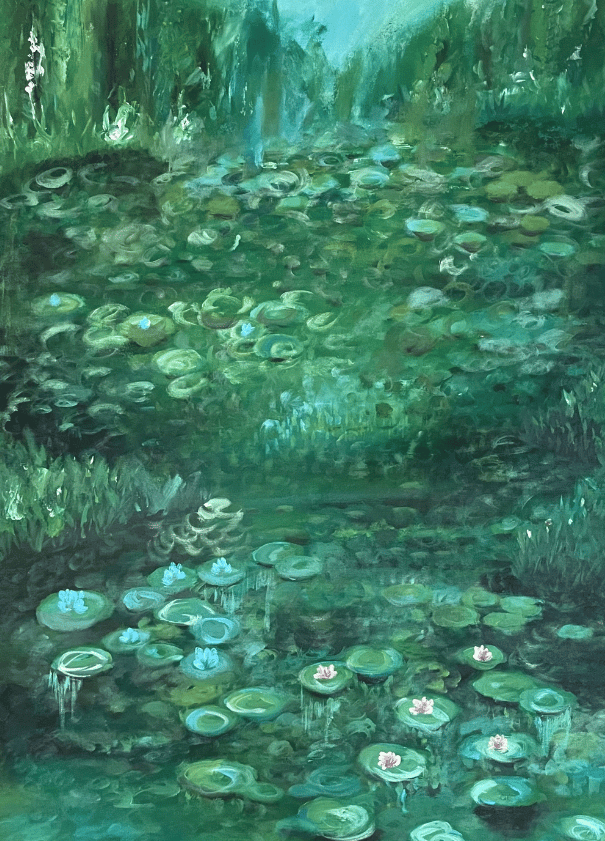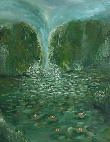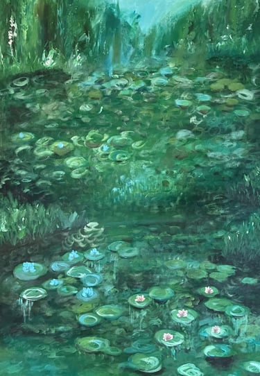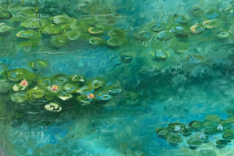 Dieses Gemälde ist inspiriert vom Impressionisten Claude Monet. Die Farbgestaltung lebt von weichen Grüntönen, die mit den reflektierenden Blauschattierungen des Wassers harmonieren.Die kleinen, lebhaften Akzente der rosa und roten Seerosen schaffen einen reizvollen Kontrast und lenken die Aufmerksamkeit des betrachtetes auf die Details der Komposition. Der Himmel in sanften Blau und zarten Wolkenschleiern gehalten, öffnet der Raum und lädt zur Reflexion ein.
